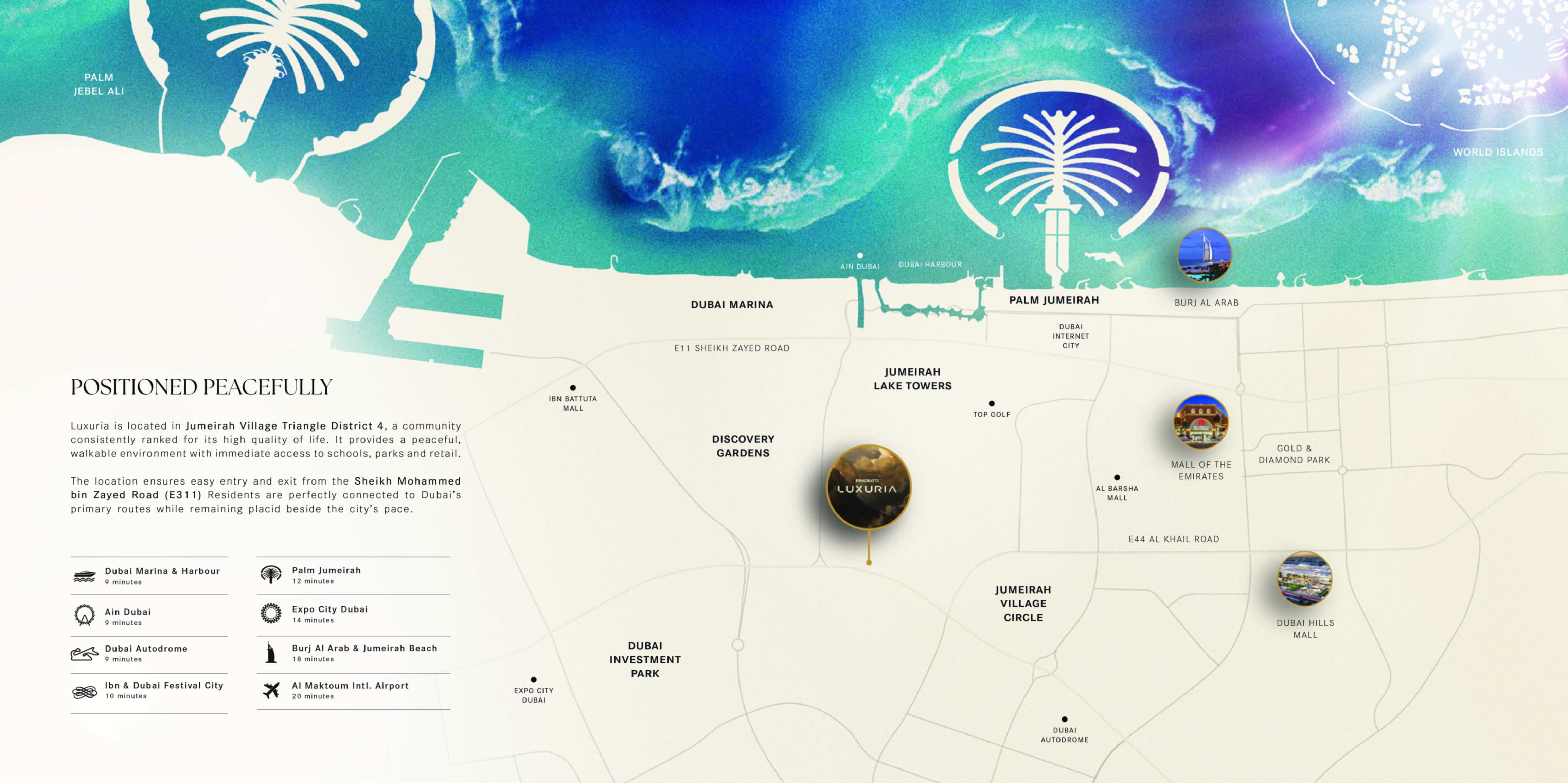 location, JVT offers the perfect balance between quiet suburban living and city convenience. With direct access to Sheikh Mohammed Bin Zayed and Al Khail Roads, residents enjoy easy commutes to Dubai Marina, Downtown Dubai, and the airport. JVT is also just minutes from top attractions like Palm Jumeirah, JBR, and Mall of the Emirates.